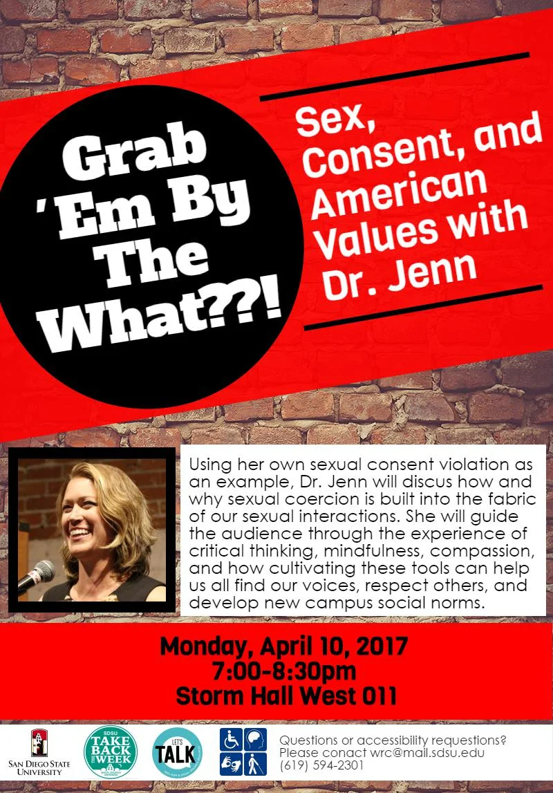 I'm so pleased and appreciative that San Diego State University is hosting my first college talk specifically on sexual consent! As the title indicates, we have some cultural values that support and even promote sexual coercion. Sexual hook-ups in the United States are rife with misunderstandings and miscommunication around consent. My talk is about how we can shift from a culture of coercion, to a culture of consent. It's all about the gray areas.